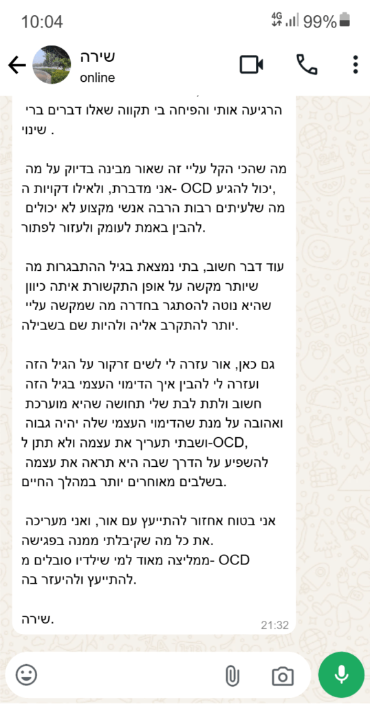 הליווי מותאם אישית לפי גיל המתמודד, סוג ה-OCD, מבנה המשפחה והשלב שבו אתם נמצאים.